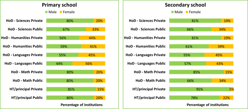 The study findings highlighted that there were proportionately more male teachers as department heads in all subject areas, especially in mathematics and sciences for both primary and secondary schools. For instance, 80% and 85% of mathematics department heads were male at public primary and private secondary schools, respectively. This gender gap was significantly reduced for humanities and languages, with the proportion of female teachers as department heads increasing.