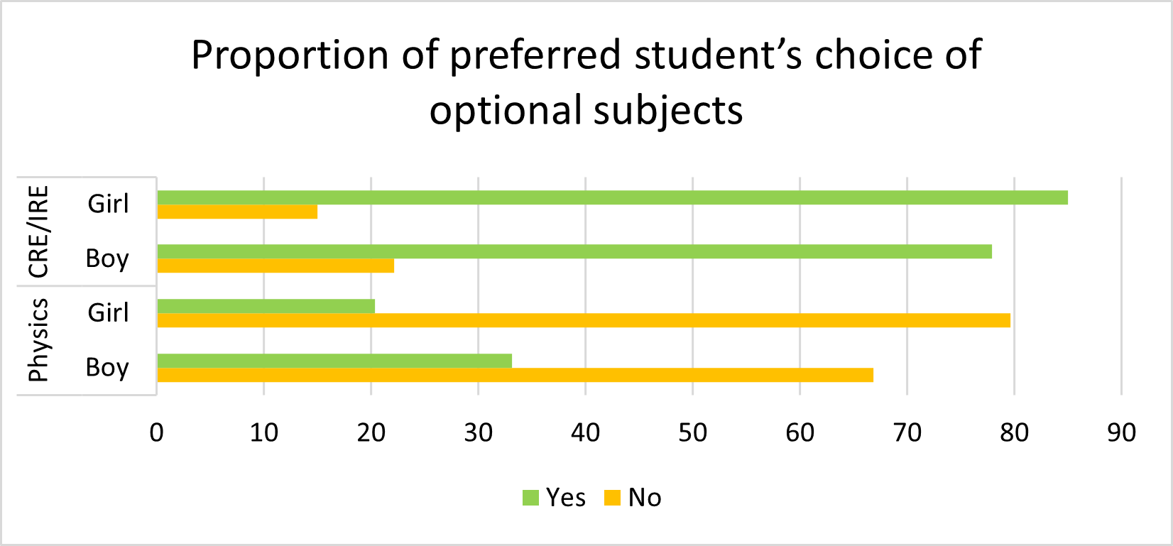 In the Kenyan 8-4-4 curriculum, learners in secondary school are required to undertake all subjects in the first two years (forms 1 and 2) and then select optional subjects that they would like to pursue in forms 3 and 4. The study thus sought to understand the preference of male and female learners to select STEM vs. humanity-related subjects. A significantly lower proportion of girls (20%) reported that they did not intend to choose physics as compared to boys (33%). Additionally, a significantly higher proportion of girls than boys intended to select Christian/Islamic religious education as an optional subject in the future, at 85% and 78%, respectively.